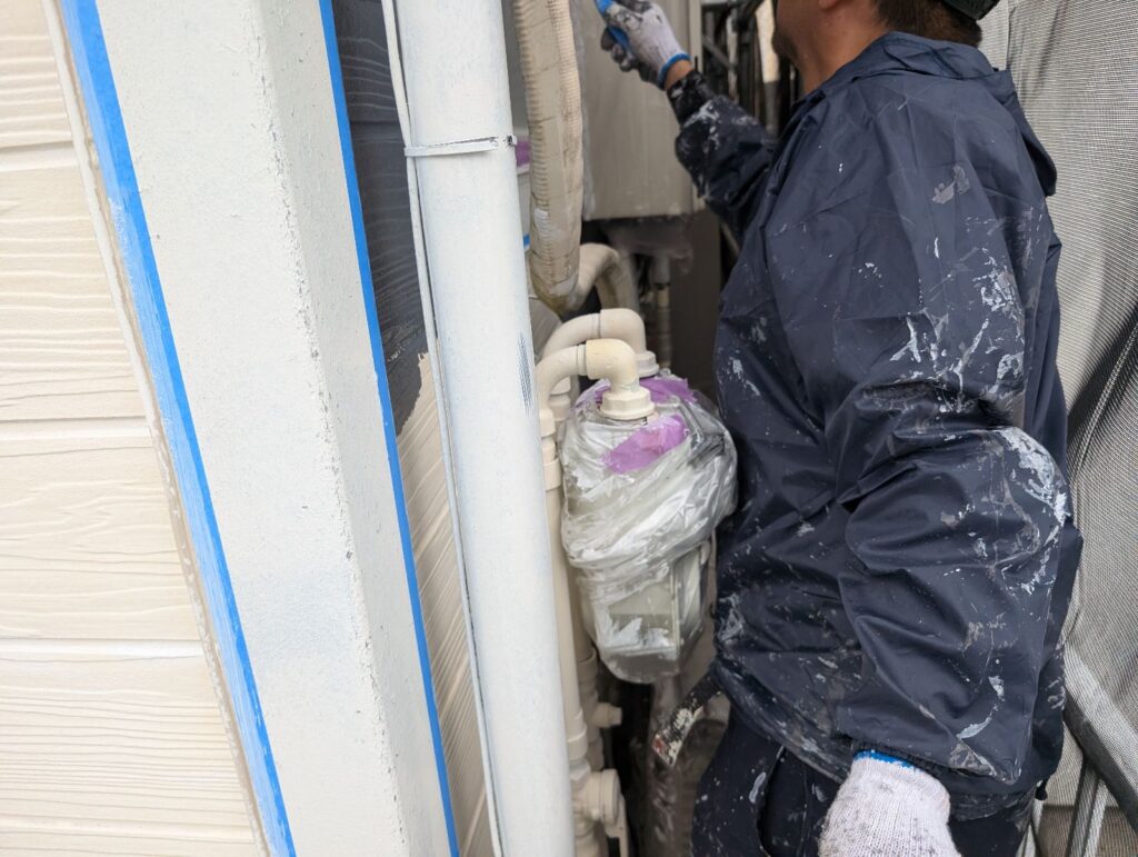 無事足場着工し、洗浄・シーリング・養生等本日終わり外壁下塗り~中塗りまで作業しておりました。