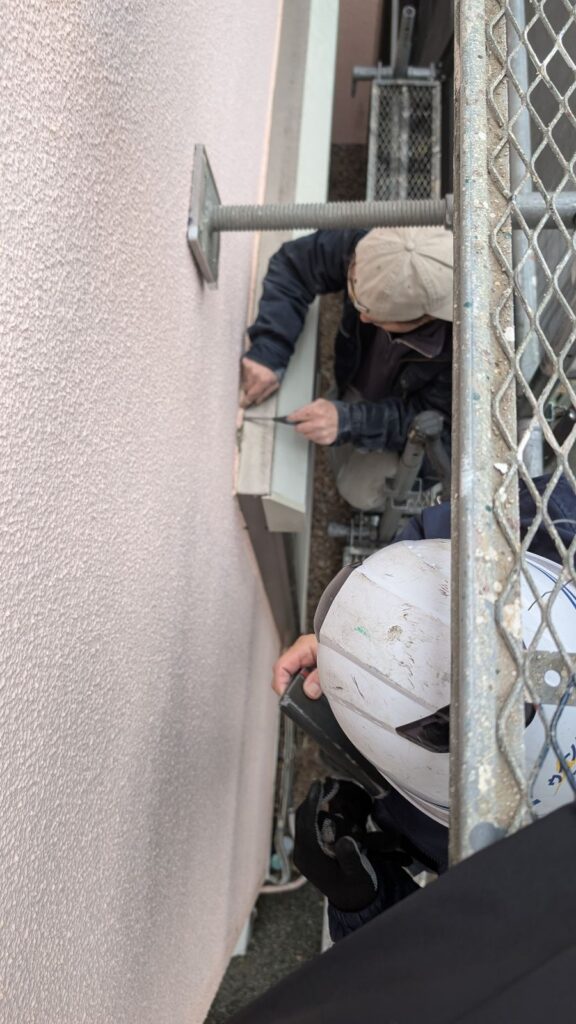 塗装前に雨漏りの原因を探す蘓武さん、遠藤さん。。。