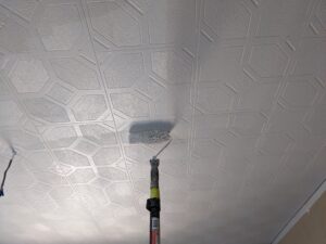 今回のようにローラーを使って丁寧に塗装することで、模様を活かしながらムラのない仕上がりになります。塗装後は天井が明るくなり、室内全体がスッキリとした清潔感のある空間に変わりました。