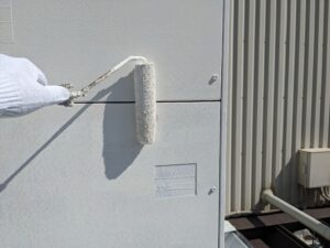 中塗りは、下塗りで整えた下地の上に塗膜の厚みをしっかり付ける重要な工程です。写真のようにローラーで均一に塗布し、塗りムラや塗り残しが出ないよう丁寧に仕上げていきます。