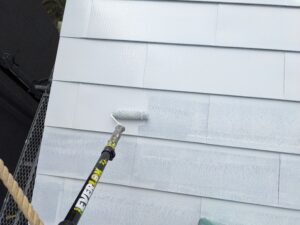 写真のようにローラーを使い、ムラが出ないよう均一に塗布していきます。特に外壁の継ぎ目や凹凸部分は塗り残しが出やすいため、丁寧に仕上げています。
