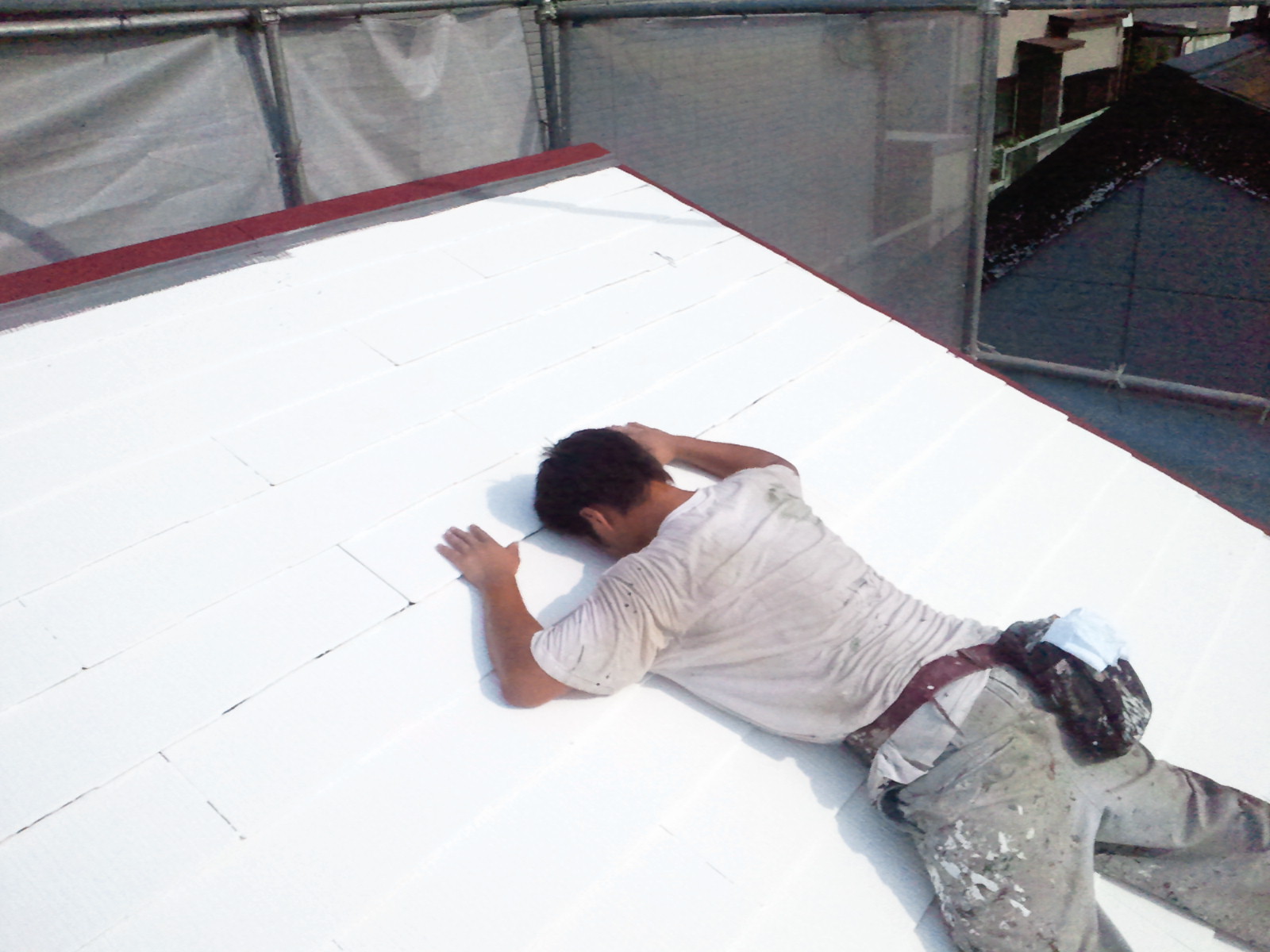 今日の最高気温は 小田原 横浜地区ともに三十四度 おそらく屋根の上は 照り返しもあり 五十度近くあったと思います。 以前にもブログにてご説明させていただきましたが、 この 『パラサーモ・シールド』 第二 第三工程目の 断熱材がすごいんです。 塗布後のヒンヤリ感はさわった者にしかわかりません ここのM様宅は 少しこうばいが急なのですが、 次回緩めの安全な屋根のとき 是非とも無人見学会に来ていただいた方に 触れて体感していただきたいです。 とにかく すごいんです。