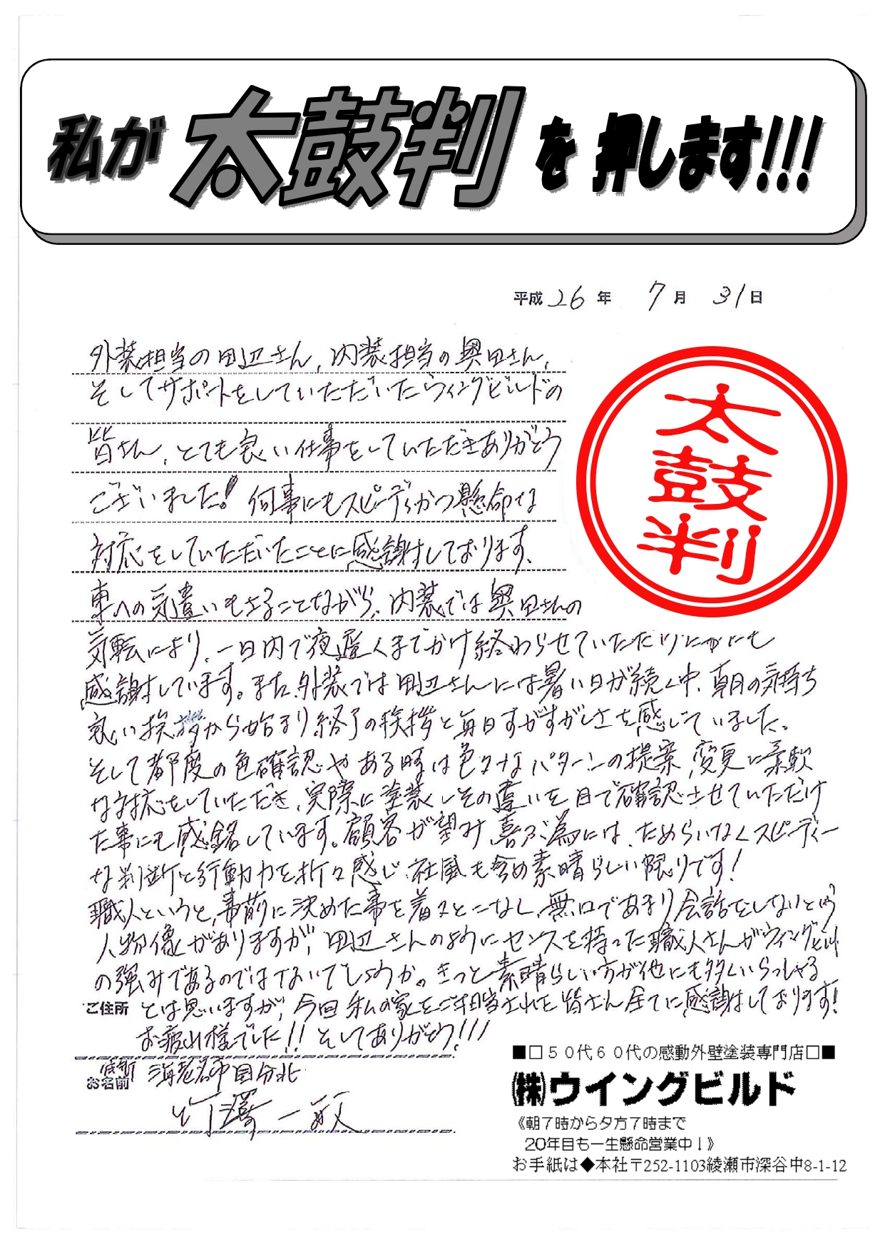 外装担当の田辺さん、内装担当の奥田さん、そしてサポートしていただいた ウイングビルドの皆さん、とても良い仕事をしていただきありがとうございました! 何事にもスピーディーかつ懸命な対応をしていただいたことに感謝しております。 車への気遣いもさることながら内装では奥田さんの気転により一日内で夜遅くまでかけ 終わらせて頂けた事にも感謝しています。 また外装では田辺さんには暑い日が続く中、朝の気持ち良い挨拶から始まり 終了の挨拶と毎日すがすがしさを感じていました。そして都度の色確認やある時は 色々なパターンの提案、変更に柔軟な対応をしていただき、実際に塗装しその違いを 目で確認させていただけた事にも感銘しています。 顧客が望み、喜ぶ為にはためらいなくスピーディーな判断と行動力を折々感じ社風も含め 素晴らしい限りです! 職人というと事前に決めた事を着々とこなし無口であまり会話をしないという人物像が ありますが、田辺さんのようにセンスを持った職人さんがウイングビルドの強みである のではないでしょうか。きっと素晴らしい方が他にも多くいらっしゃるとは思いますが 今回私の家をご担当された皆さん全てに感謝しております! お疲れ様でした!!そしてありがとう!!! 海老名市 竹澤様より塗装工事のコメントを頂きました。 ありがとうございました!