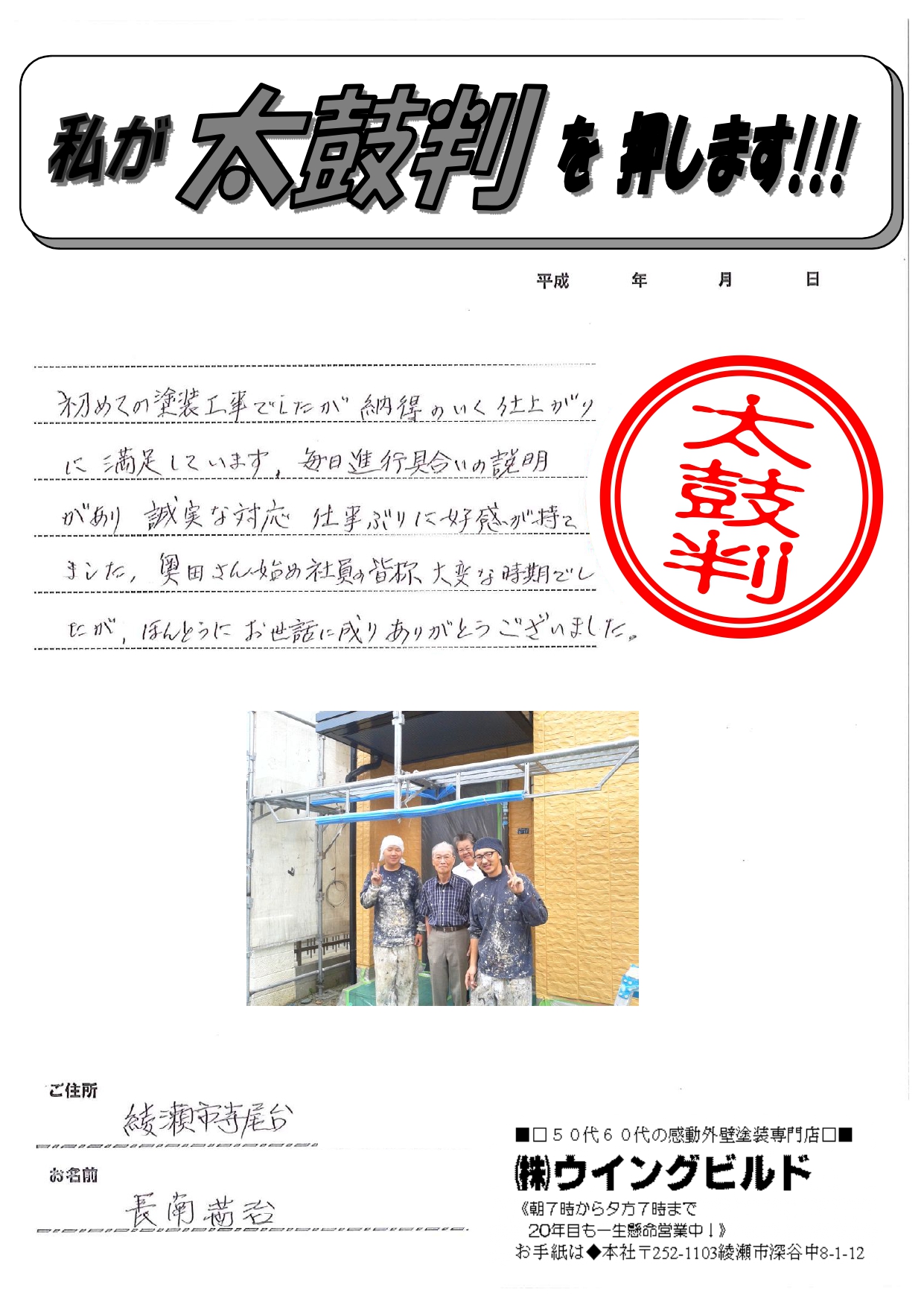 綾瀬市 長南様より外壁塗装工事のコメントを頂きました。