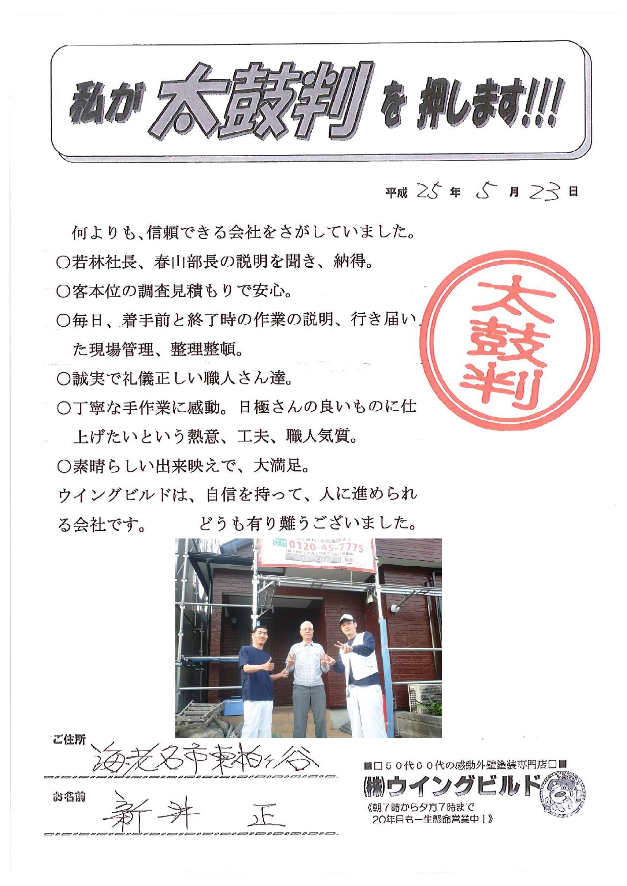 何よりも、信頼できる会社をさがしていました。 ○若林社長、春山部長の説明を聞き、納得。 ○客本位の調査見積もりで安心。 ○毎日、着手前と終了時の作業の説明、行き届いた現場管理、整理整頓。 ○誠実で礼儀正しい職人さん達。 ○丁寧な手作業に感動。日極さんの良いものに仕上げたいという熱意、工夫、職人気質。 ○素晴らしい出来映えで、大満足。 ウイングビルドは、自信を持って、人に進められる会社です。 どうも有り難うございました。