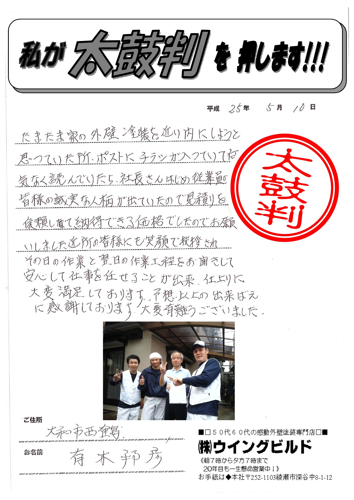 たまたま家の外壁塗装を近い内にしようと 思っていた所、ポストにチラシが入っていて 何気なく読んでいたら、社長さんはじめ従業員の 皆様の誠実な人柄が出ていたので見積もりを 依頼して納得できる価格でしたのでお願いいたしました。 近所の皆様にも笑顔で挨拶され その日の作業と翌日の作業工程をお聞きして 安心して仕事を任せることが出来、 仕上りに大変満足しております。 予想以上の出来ばえに感謝しております。 大変有難うございました。