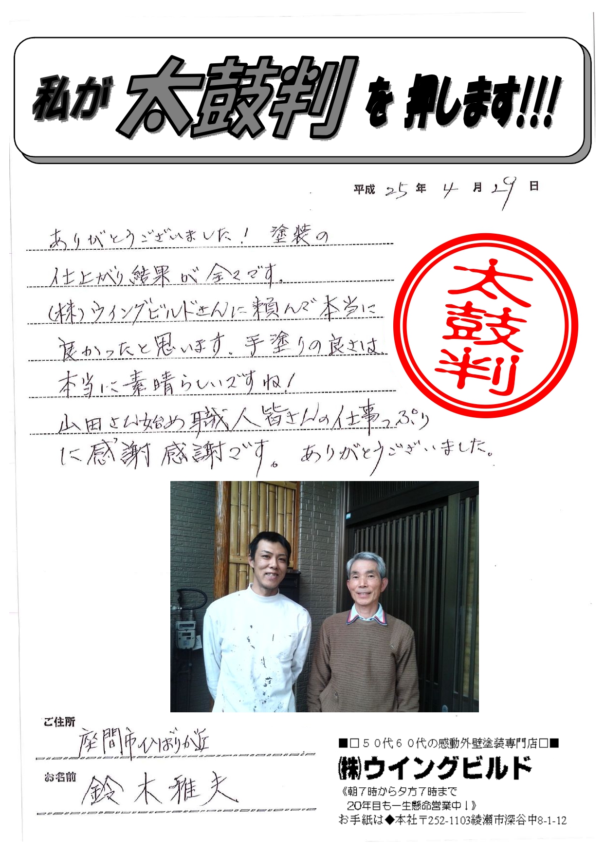 ありがとうございました! 塗装の仕上がり結果が全てです。 ㈱ウイングビルドさんに頼んで本当に良かったと思います。 手塗りの良さは本当に素晴らしいですね! 山田さん始め職人皆さんの仕事っぷりに感謝感謝です。 ありがとうございました。