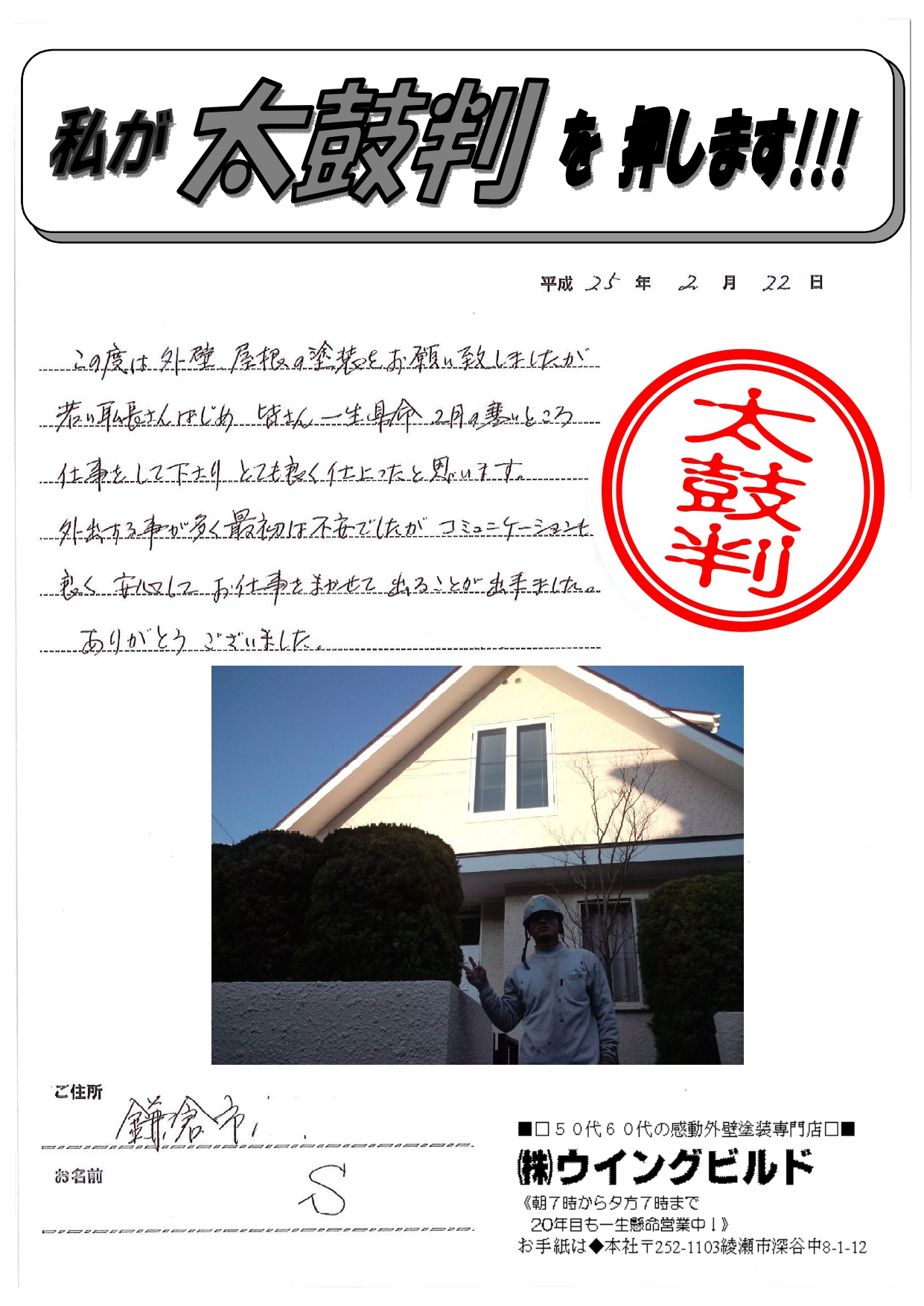 この度は外壁、屋根の塗装をお願い致しましたが 若い耺長さんはじめ、皆さん一生懸命 2月の寒いところ仕事をして下さり、とても良く仕上ったと思います。 外出する事が多く最初は不安でしたが、コミュニケーションも良く安心して お仕事をまかせて出ることが出来ました。 ありがとうございました。
