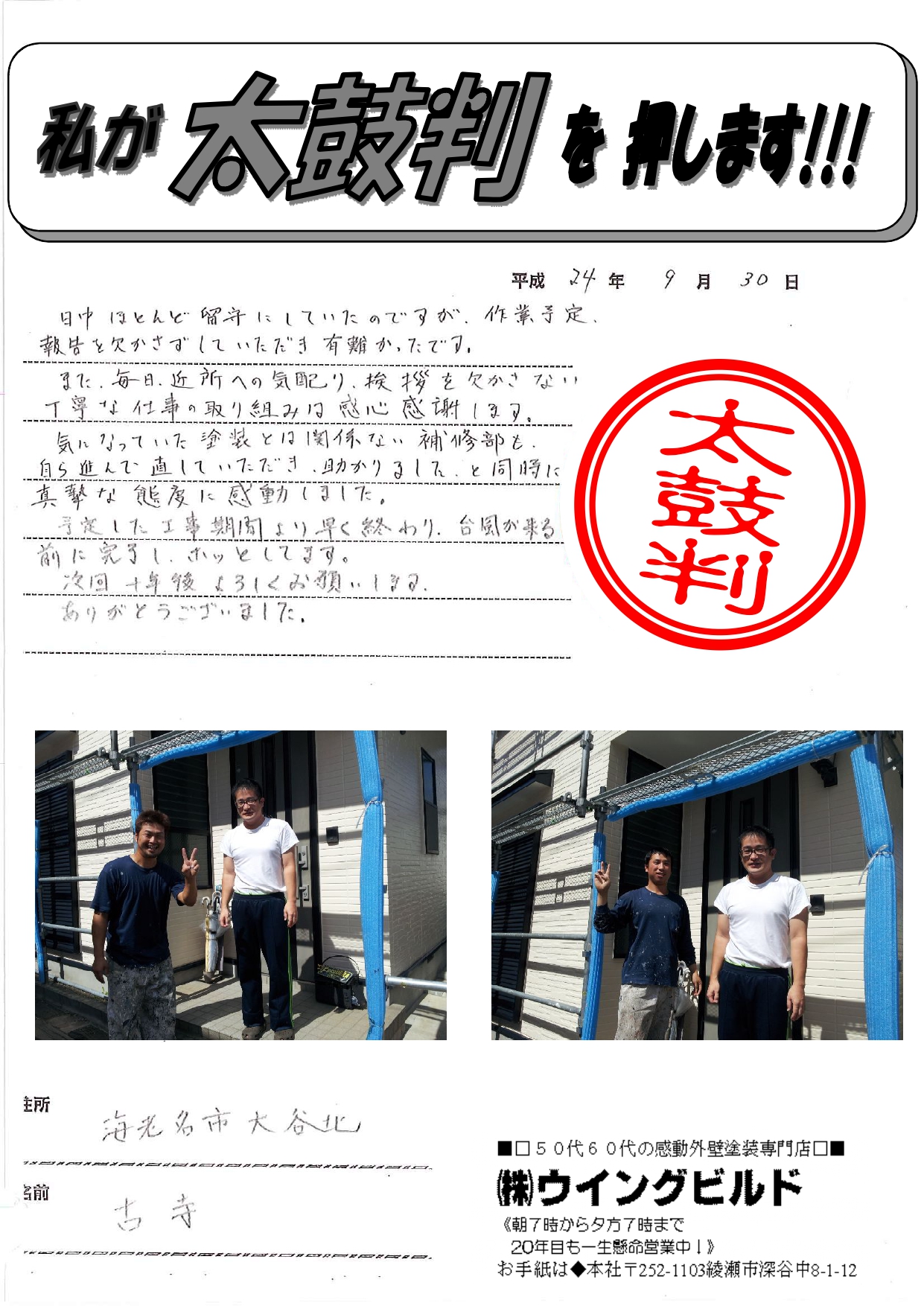 日中ほとんど留守にしていたのですが、作業予定報告を欠かさずしていただき有り難かったです。 また、毎日近所への気くばり、挨拶を欠かさない 丁寧な仕事の取り組みは感心感謝します。 気になっていた塗装とは関係ない補修部も自ら進んで直していただき助かりました。と同時に真摯な態度に感動しました。 予定した工事期間より早く終わり、台風が来る前に完了し ホッとしてます。 次回、十年後よろしくお願いします。 ありがとうございました。