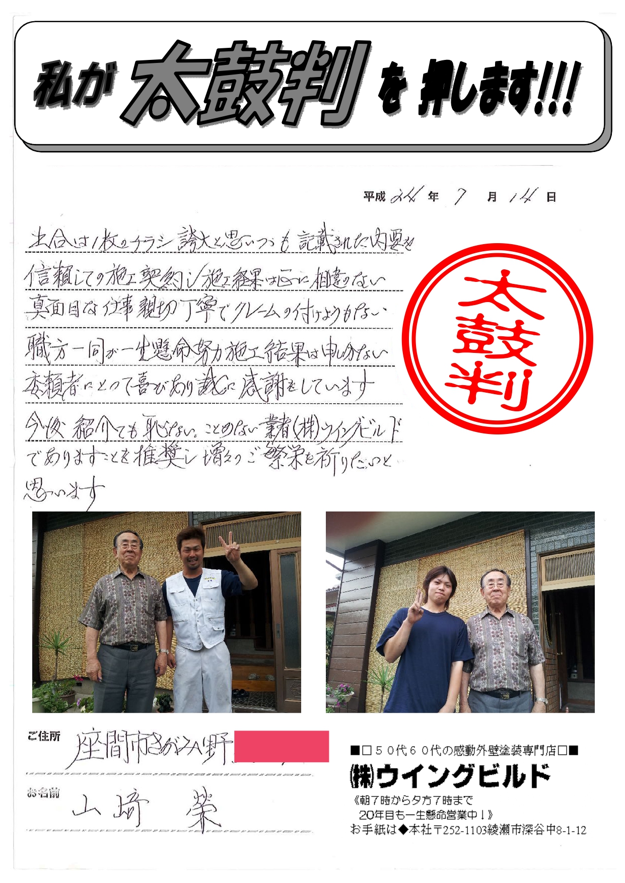 出合いは1枚のチラシ誇大と思いつつも記載された内要を 信頼して施工契約し施工経果は己に相違のない真面目な仕事 親切丁寧でクレームの付けようもない職方一同が一生懸命努力施工結果は申し分ない 委頼者にとって喜びあり誠に感謝しています 今後、紹介しても恥ない。ことのない業者(株)ウイングビルドでありますことを推奨し増々のご繁栄を祈りたいと思います。