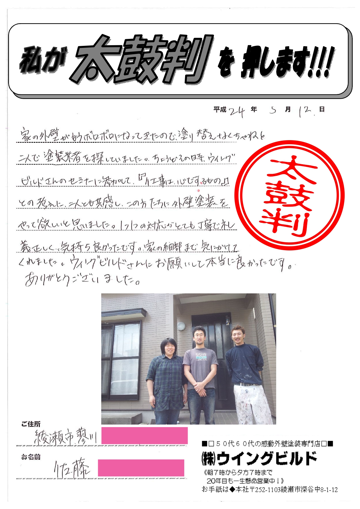 ちょうどその時、ウイングビルドさんのセミナーに参加して『仕事は心でするもの』との考えに、二人とも共感し、この方たちに外壁塗装をやって欲しいと思いました。