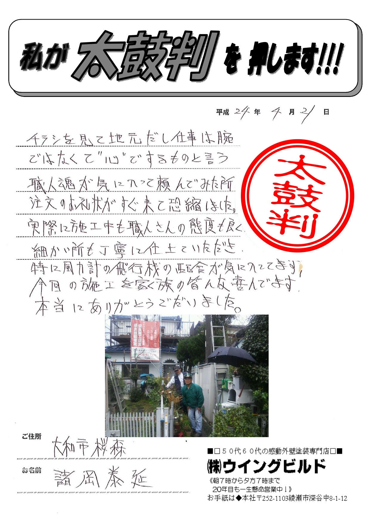 チラシを見て地元だし仕事は腕ではなくて“心”でするものと言う職人魂が気に入って頼んでみた所、注文のお礼状がすぐ来て恐縮しました。