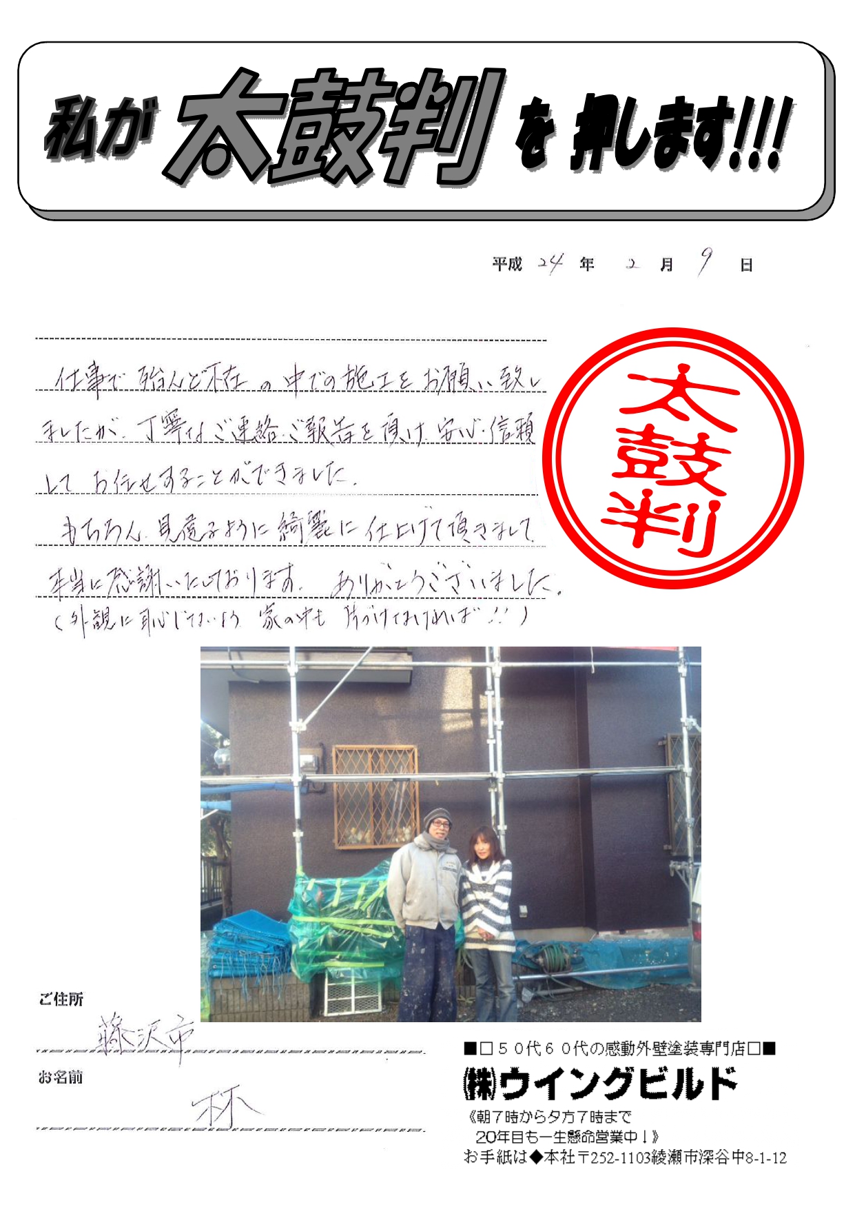 ありがとうございました。(外観に恥じないよう、家の中も片付けなければ!!)