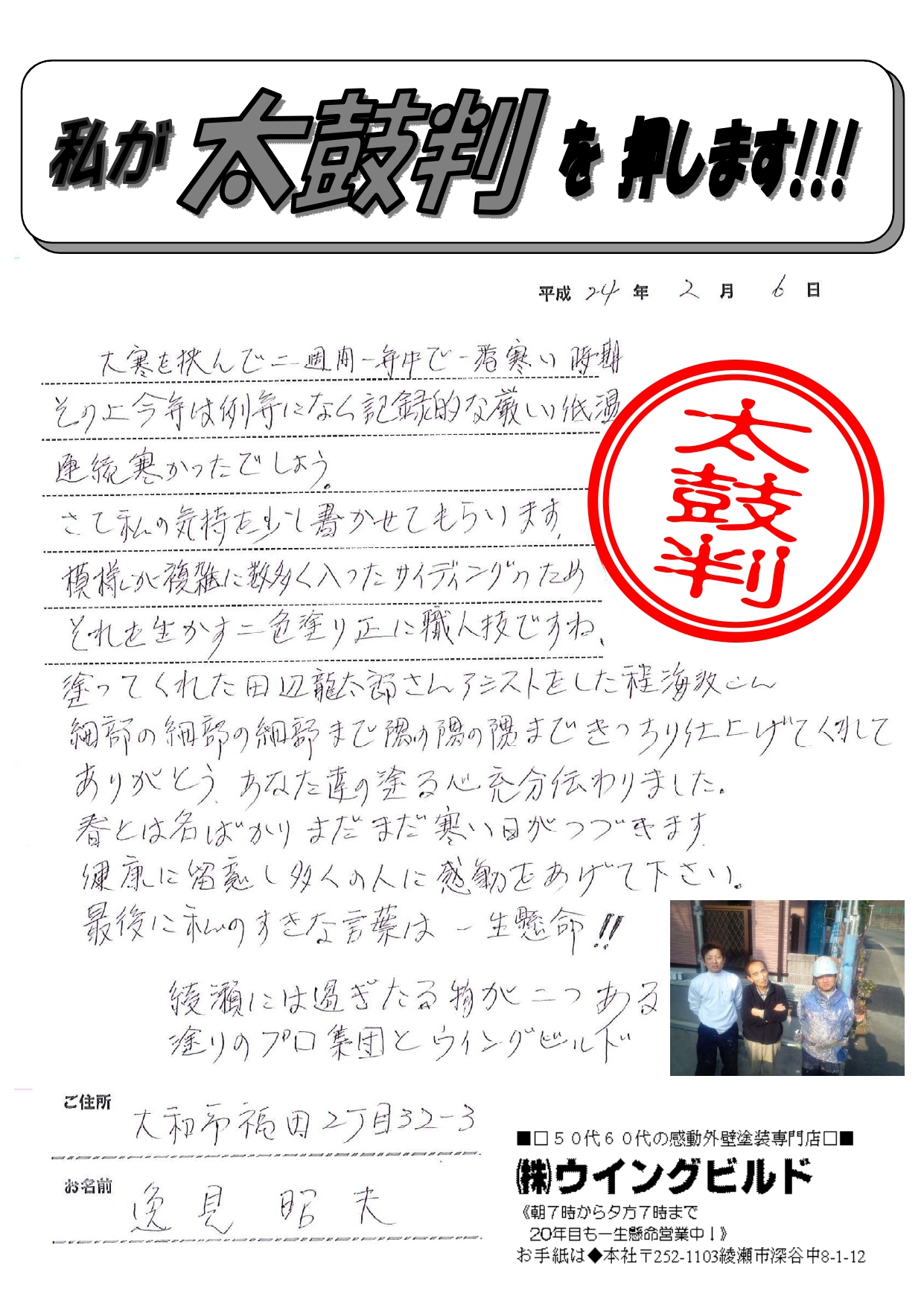 大寒を挟んで二週間、一年中で一番寒い時期その上 今年は例年にない記録的な厳しい低温連続寒かったでしょう。 さて私の気持ちを少し書かせてもらいます。 模様が複雑に数多く入ったサイディングのため、それを生かす二色塗り正に職人技ですね。 塗ってくれた田辺龍太郎さん、アシストをした程 海汲さん 細部の細部の細部まで隅の隅の隅まできっちり仕上げてくれてありがとう。 あなた達の塗る心充分伝わりました。 春とは名ばかり、まだまだ寒い日がつづきます。 健康に留意し多くの人に感動をあげて下さい。 最後に私のすきな言葉は 一生懸命!! 綾瀬には過ぎたる物が二つある。 塗りのプロ集団とウイングビルド。