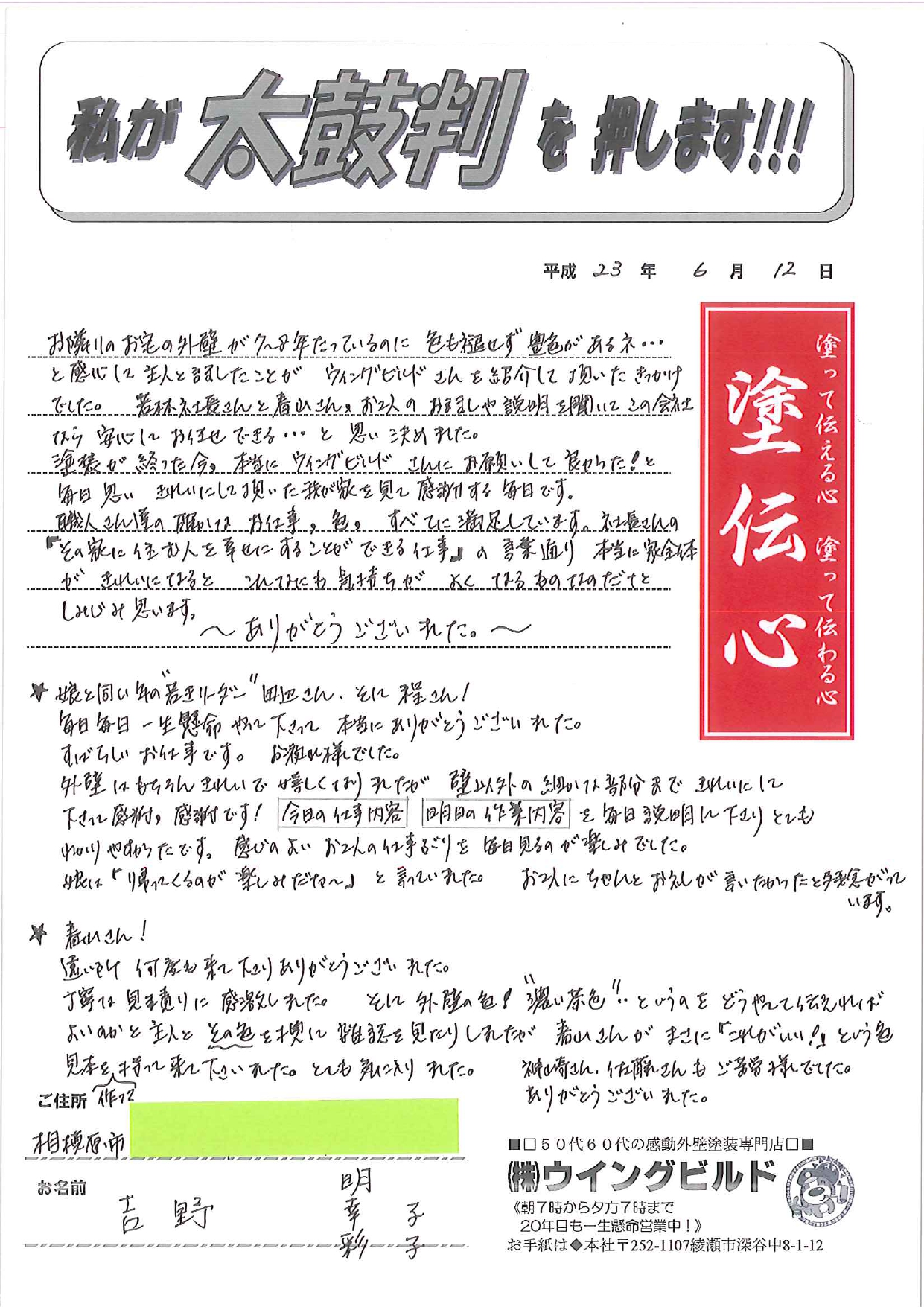 お隣りのお宅の外壁が7~8年経っているのに色も褪せず豊色があるね!と感心して主人と話したことがウイングビルドさんを紹介していただいたきっかけでした。 若林社長さんと春山さんのお二人のお話や説明を聞いてこの会社なら安心してお任せできる!と思い決めました。 塗装が終わった今、本当にウイングビルドさんにお願いして良かったと毎日思い、キレイにして頂いた我が家を見て感謝する毎日です。 職人さんたちの確かなお仕事、すべてに満足しています。 社長さんの「その家に住む人を幸せにすることができる仕事」の言葉通り、本当に家全体がきれいにするとこんなにも気持ちが良くなるものなのだと、しみじみ思います。 ~ありがとうございました~