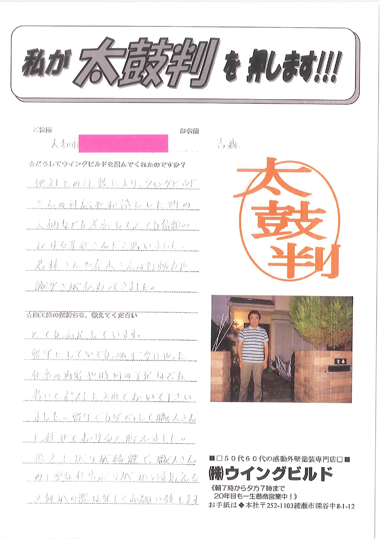 他社との比較によりウイングビルドさんの対応や、お話した時の人柄などを考慮して、とても信頼のおける業者さんだと思いました。若林社長さんや春山さんの行動力や誠実さが伝わってきました。