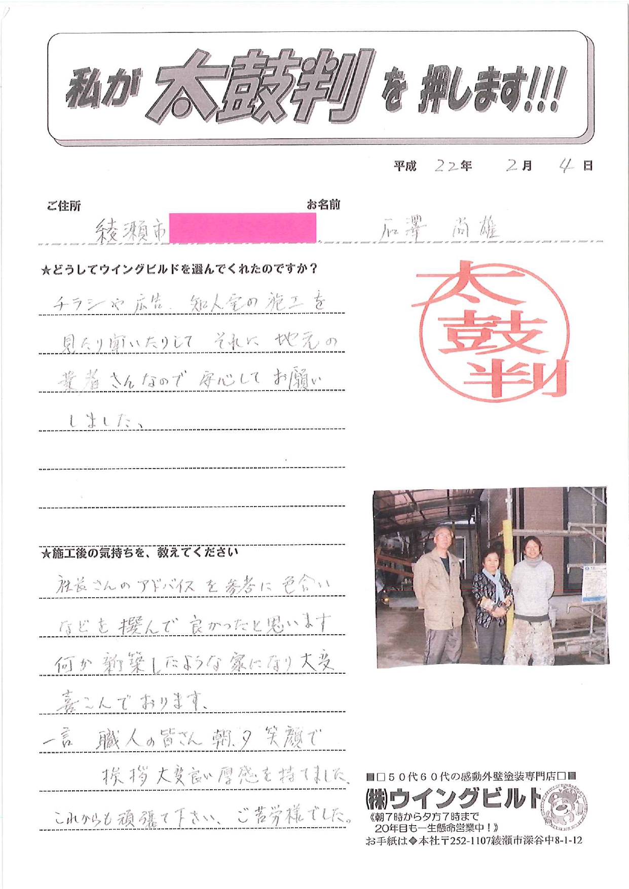 (一言)「職人の皆さん、朝夕、笑顔で挨拶大変良い好感をもてました。これからも頑張ってください。ご苦労様でした!」
