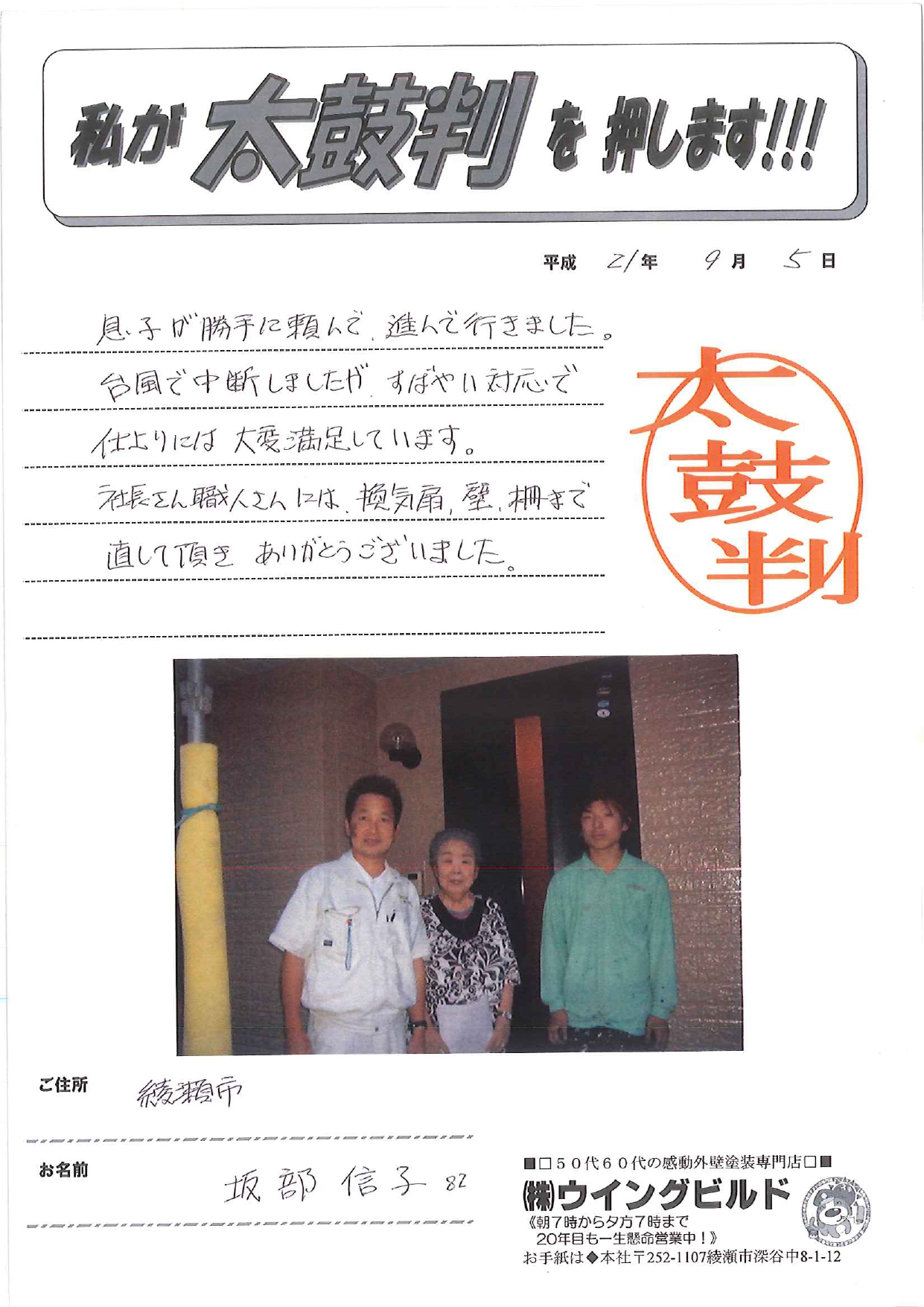 息子が勝手に頼んで、進んで行きました。 台風で中断しましたが、すばやい対応で仕上りには大変満足しています。 社長さんには換気扇、壁、柵まで直して頂き、ありがとうございました。