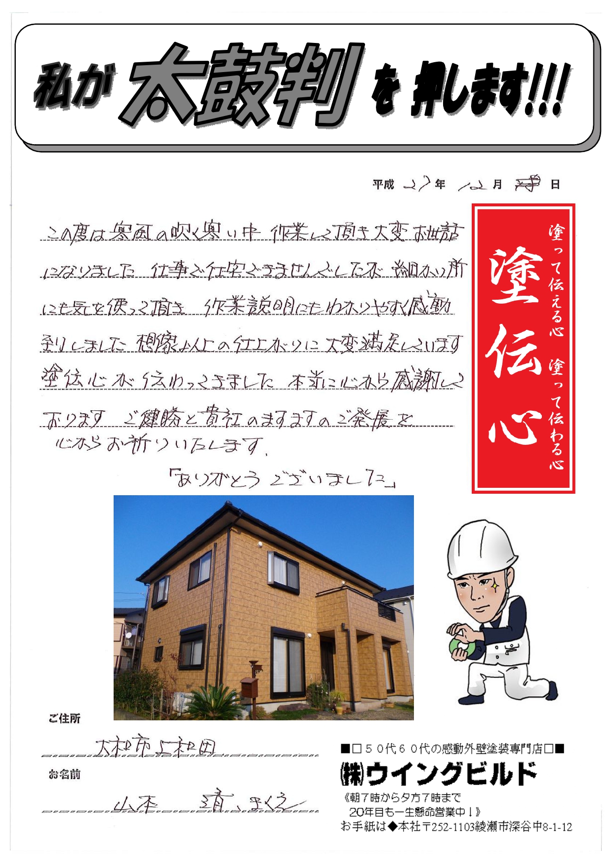 この度は寒風の吹く寒い中 作業して頂き大変お世話になりました 仕事で在宅できませんでしたが細かい所にも気を使って頂き 作業説明にもわかりやすく感動致しました 想像以上の仕上がりに大変満足しています 塗伝心が伝わってきました 本当に心から感謝しております ご健勝と貴社のますますのご発展を 心からお祈りいたします 「ありがとうございました」 大和市 山本様より外壁塗装工事のコメントを頂きました! ありがとうございました!