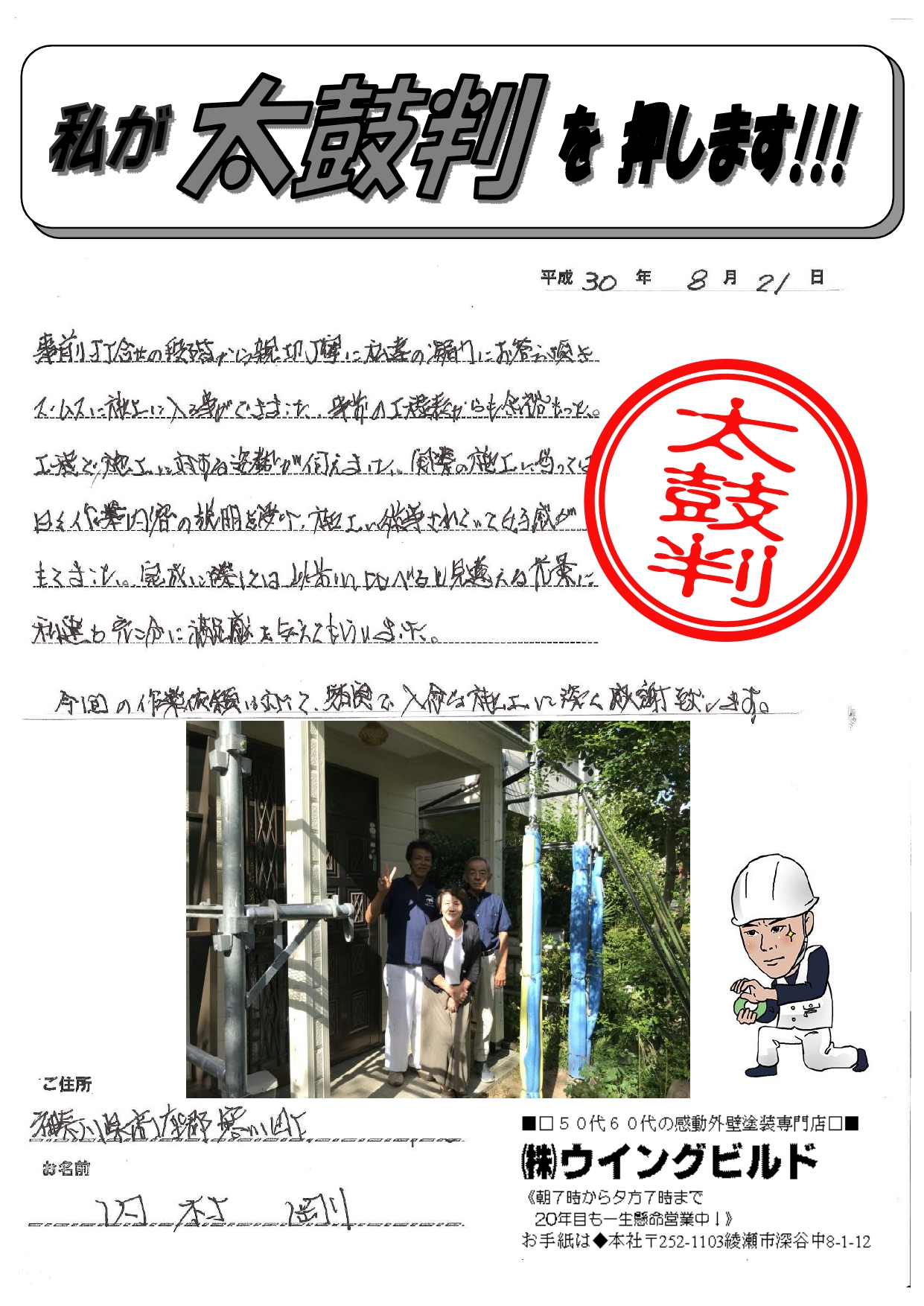 事前打合せの段階から親切丁寧に私達の疑問にお答え頂き スムースに施工に入る事ができました。 事前の工程表からも余裕をもった工程で 施工に対する姿勢が伺えました。 施工にあたっては日々作業内容の説明を受け、 施工に従事されていて好感がもてました。 完成に際しては以前に比べると見違える光景に 私達も十二分に満足感を与えてもらいました。 今回の作業依頼に関して入念な施工に深く感謝致します。 高座郡寒川町 内村様より外壁塗装・屋根塗装工事の 太鼓判を頂きました! ありがとうございました!!