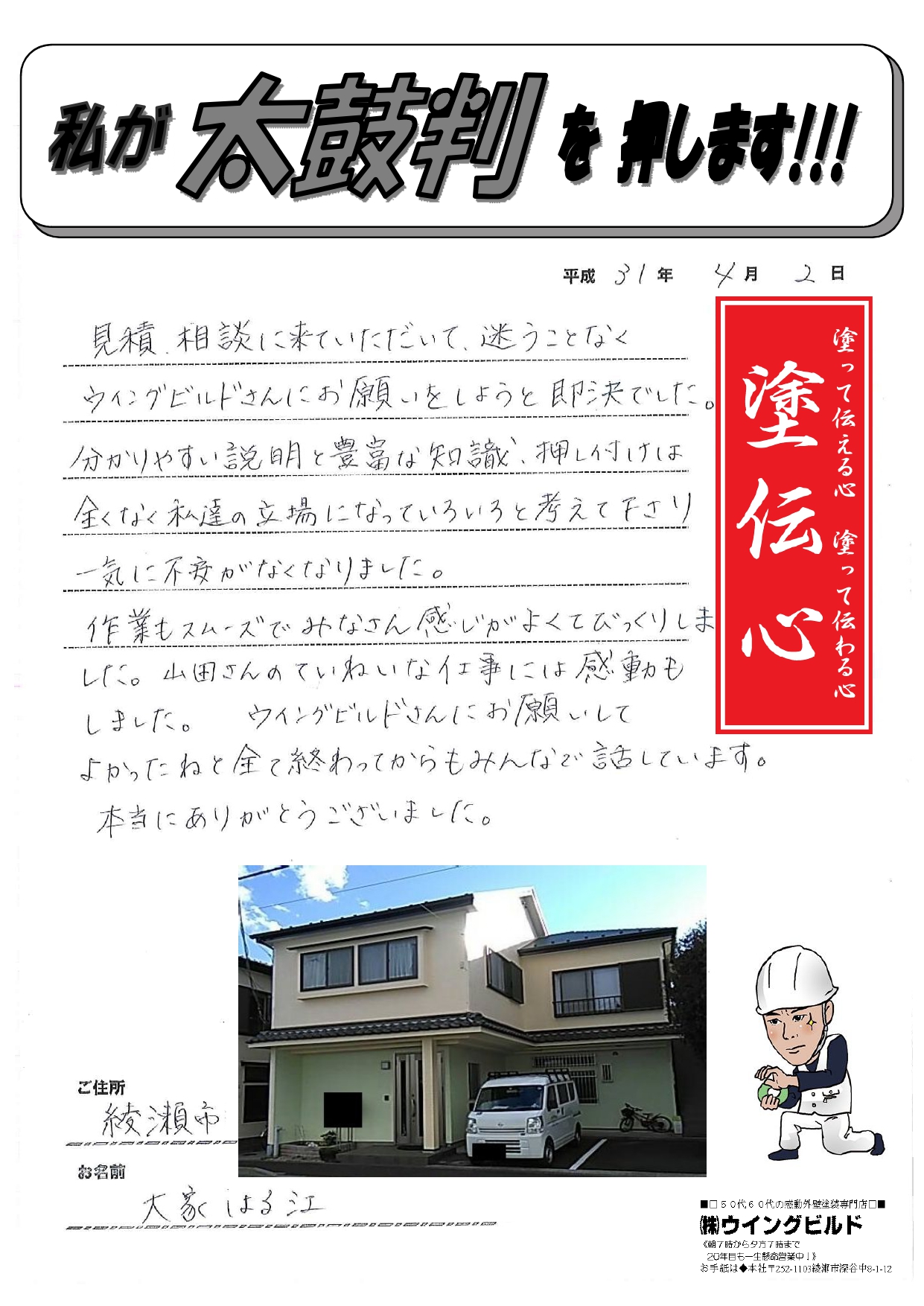 見積・相談に来ていただいて、迷うことなく ウイングビルドさんにお願いしようと即決でした。 分かりやすい説明と豊富な知識、押し付けは全くなく 私達の立場になっていろいろと考えて下さり 一気に不安がなくなりました。 作業もスムーズでみなさん感じがよくて びっくりしました。 山田さんのていねいな仕事には感動もしました。 ウイングビルドさんにお願いしてよかったねと 全て終わってからもみんなで話しています。 本当にありがとうございました。 綾瀬市 大家様より外壁屋根塗装工事の太鼓判をいただきました! ありがとうございました!!