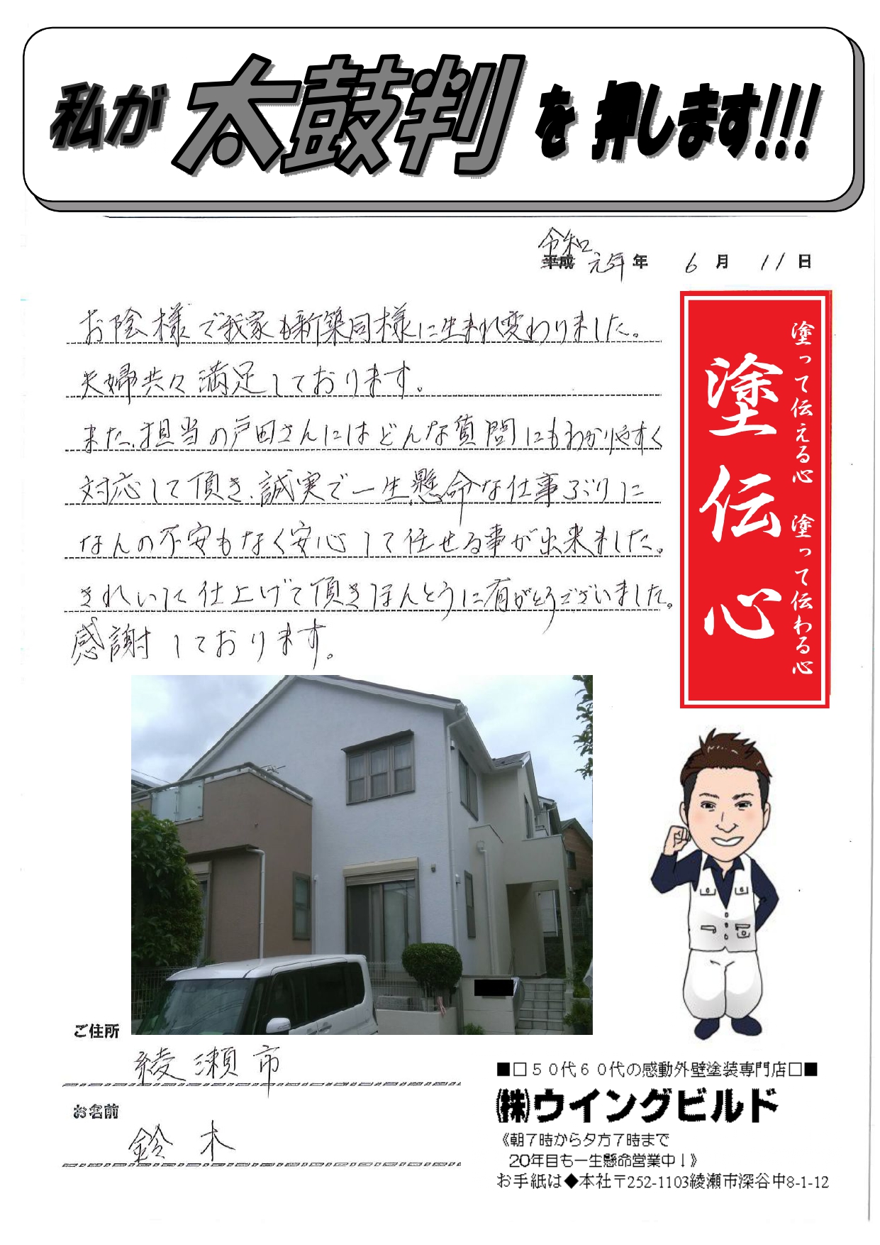 綾瀬市 鈴木様より外壁屋根塗装工事の太鼓判をいただきました!