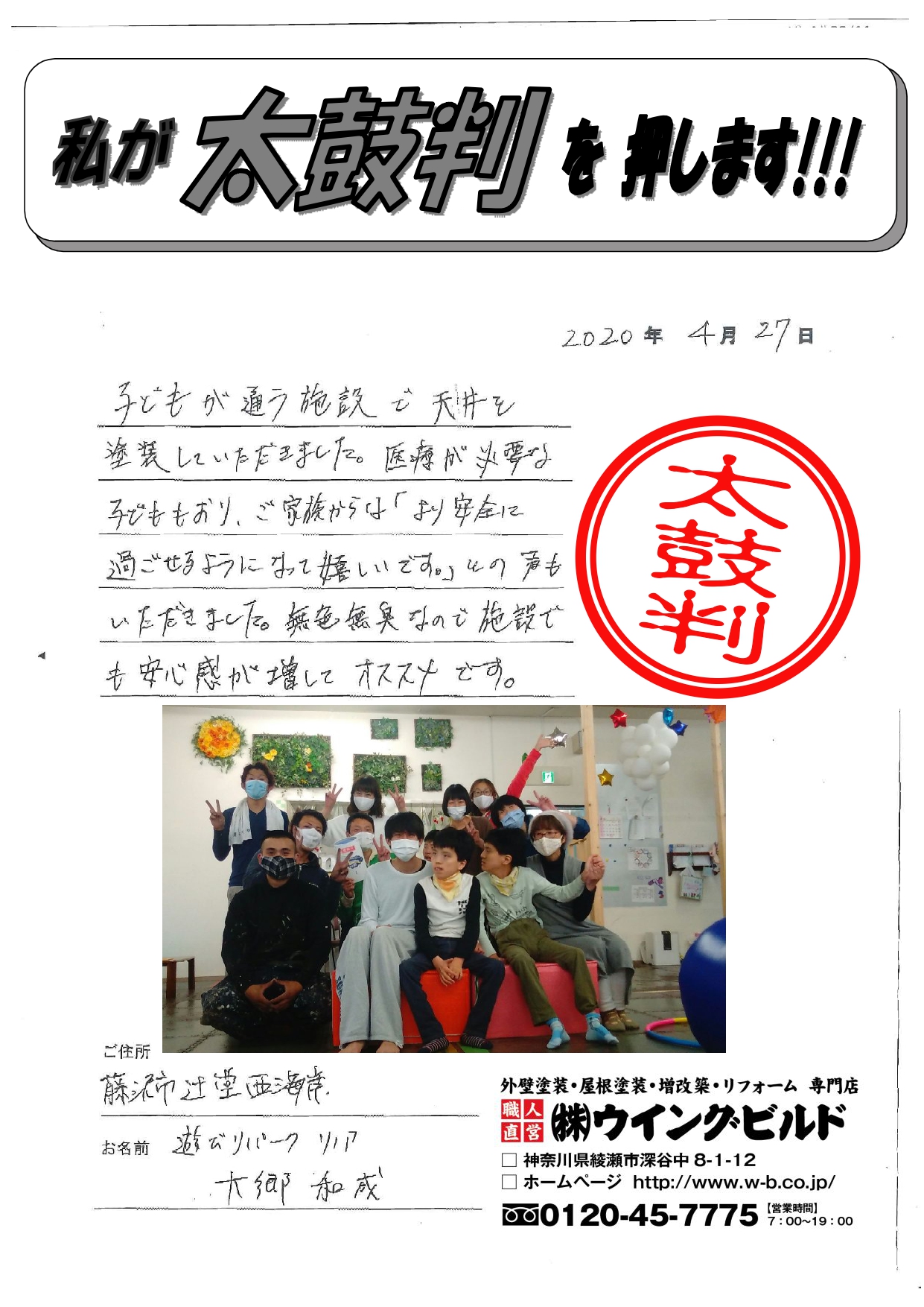 遊びリパーク リノアさまより室内抗菌塗装の太鼓判をいただきました!