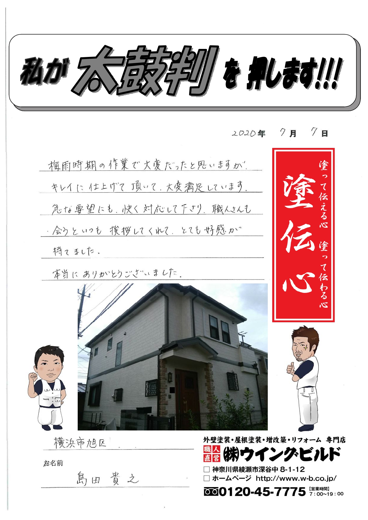 横浜市 島田様より外壁屋根塗装工事のコメントをいただきました。