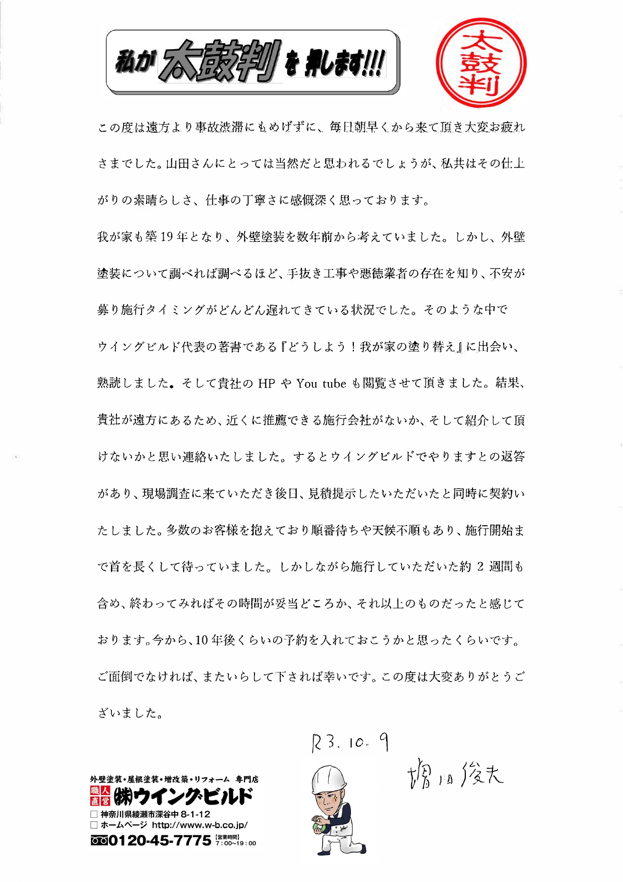 この度は遠方より事故渋滞にもめげずに、毎日朝早くから来て頂き大変お疲れさまでした。 山田さんにとっては当然だと思われるでしょうが、 私共はその仕上がりの素睛らしさ、 仕事の丁寧さに感慨深く思っております。 我が家も第19年となり、 外壁塗装を数年前から考えていました。 しかし、 外壁 塗装について調べれば調べるほど、手抜き工事や悪徳業者の存在を知り、 不安が募り施行タイミングがどんどん遅れてきている状況でした。 そのような中でウイングビルド代表の著書である「どうしよう!我が家の塗り替え』に出会い、 熟読しました。 そして貴社の HP や YouTube も閲覧させて頂きました。 結果、 貴社が遠方にあるため、近くに推薦できる施行会社がないか、 そして紹介して頂 けないかと思い連絡いたしました。 するとウイングビルドでやりますとの返答があり、 現場調査に来ていただき後日、見積提示したいただいたと同時に契約い たしました。 多数のお客様を抱えており順番待ちや天候不順もあり、 施行開始ま で首を長くして待っていました。 しかしながら施行していただいた約2週間も含め、 終わってみればその時間が妥当どころか、 それ以上のものだったと感じて おります。 今から、10年後くらいの予約を入れておこうかと思ったくらいです。 ご面倒でなければ、またいらしてドされば幸いです。 この度は大変ありがとうございました。 増田さまより外壁屋根塗装工事のコメントを頂きました! ありがとうございました。