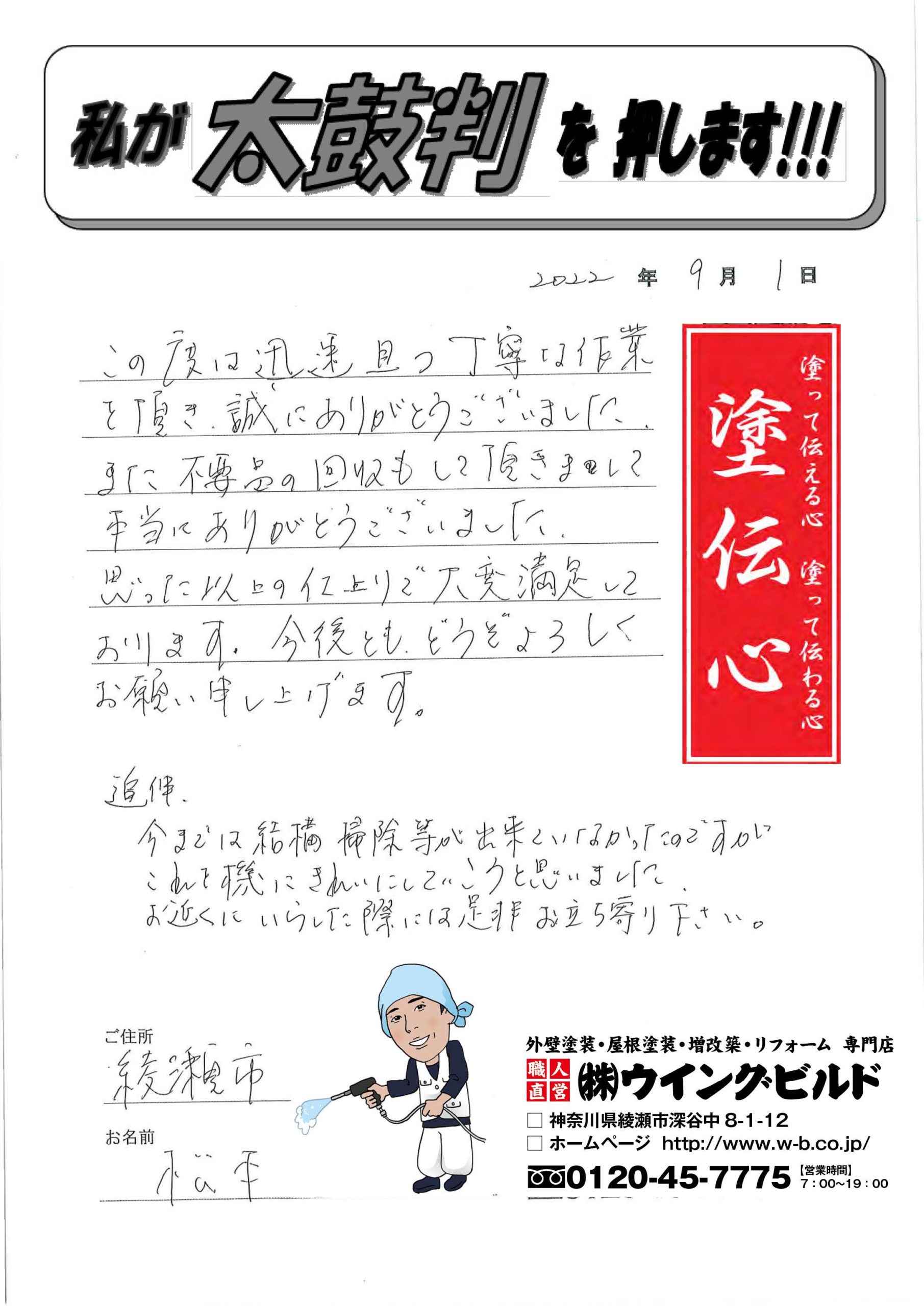 この度は迅速且つ丁寧な作業を頂き誠にありがとうございました。