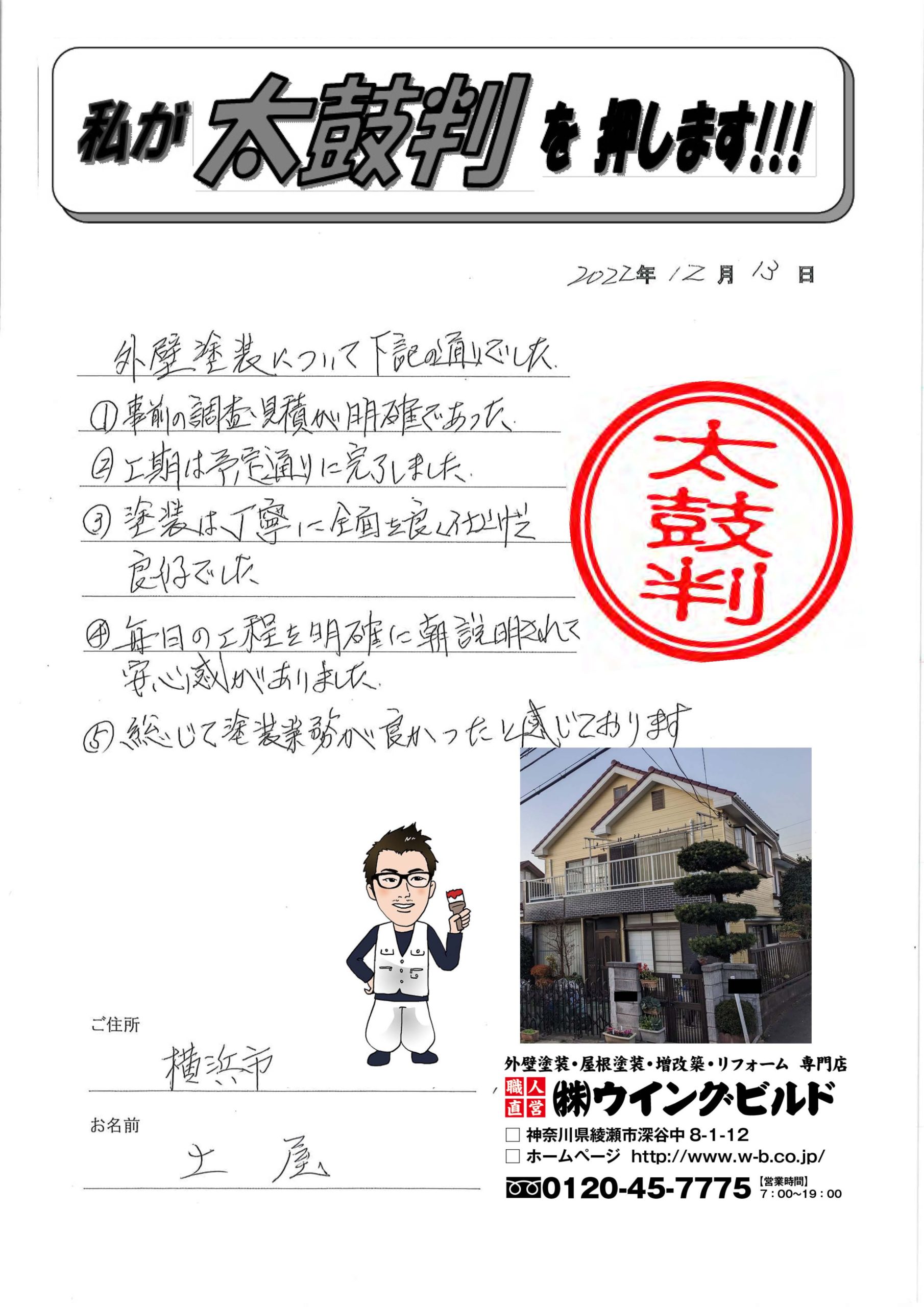 外壁塗装について下記の通りでした ①事前の調査・見積もりが明確であった ②工期は予定通りに完了しました ③塗装は丁寧に全面を良く仕上げて良好でした ④毎日の工程を明確に朝、説明されて安心感がありました ⑤総じて塗装業務が良かったと感じております