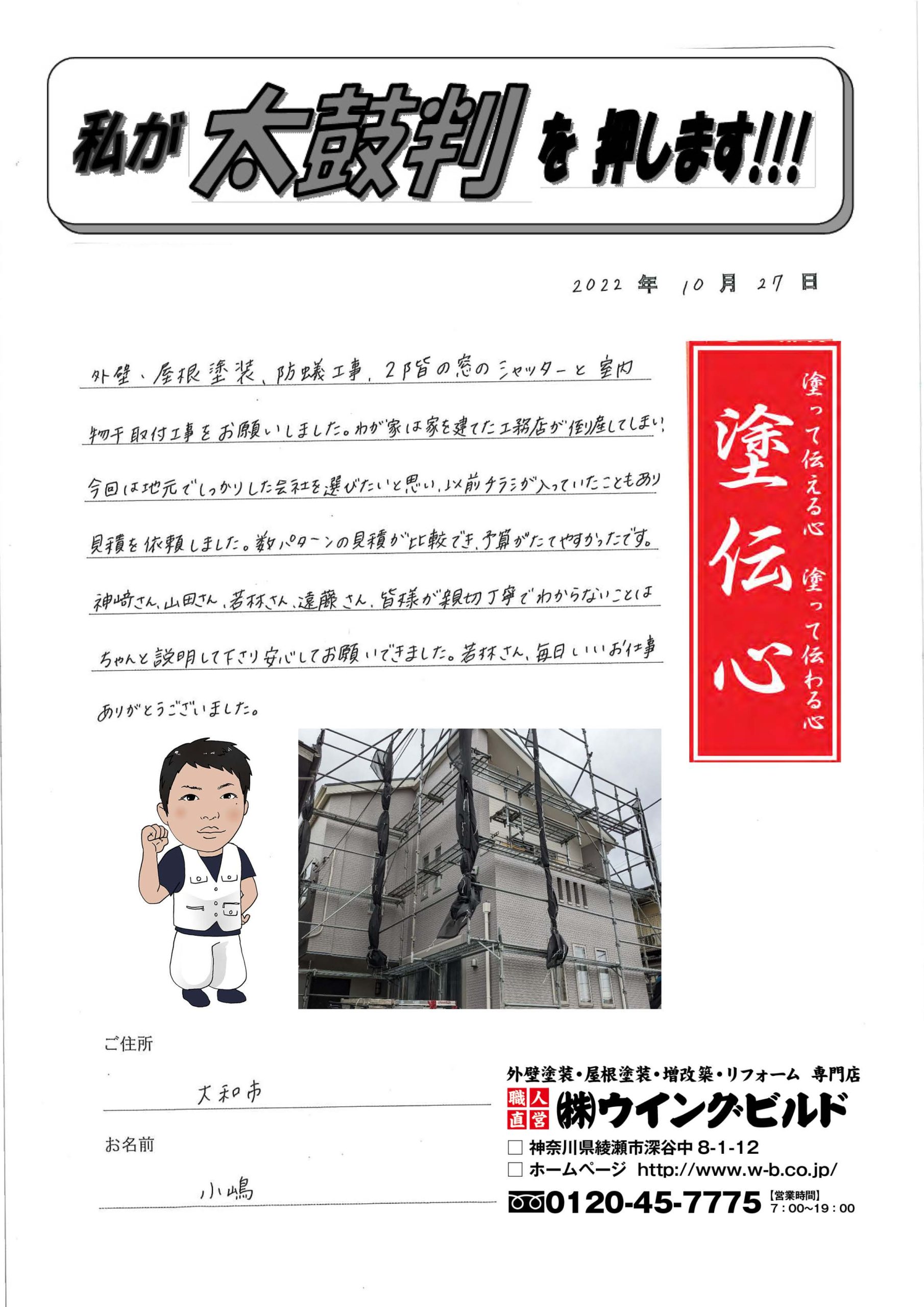 外壁・屋根塗装、防蟻工事、2階の窓のシャッターと室内物干取付工事をお願いしました。我が家は家を建てた工務店が倒産してしまい、今回は地元でしっかりした会社を選びたいと思い、以前チラシが入っていたこともあり見積もりを依頼しました。数パターンの見積が比較でき、予算がたてやすかったです。神﨑さん、山田さん、若林さん、遠藤さん、皆様が親切丁寧でわからないことはちゃんと説明してくださり安心してお願いできました。若林さん、毎日いいお仕事ありがとうございました。