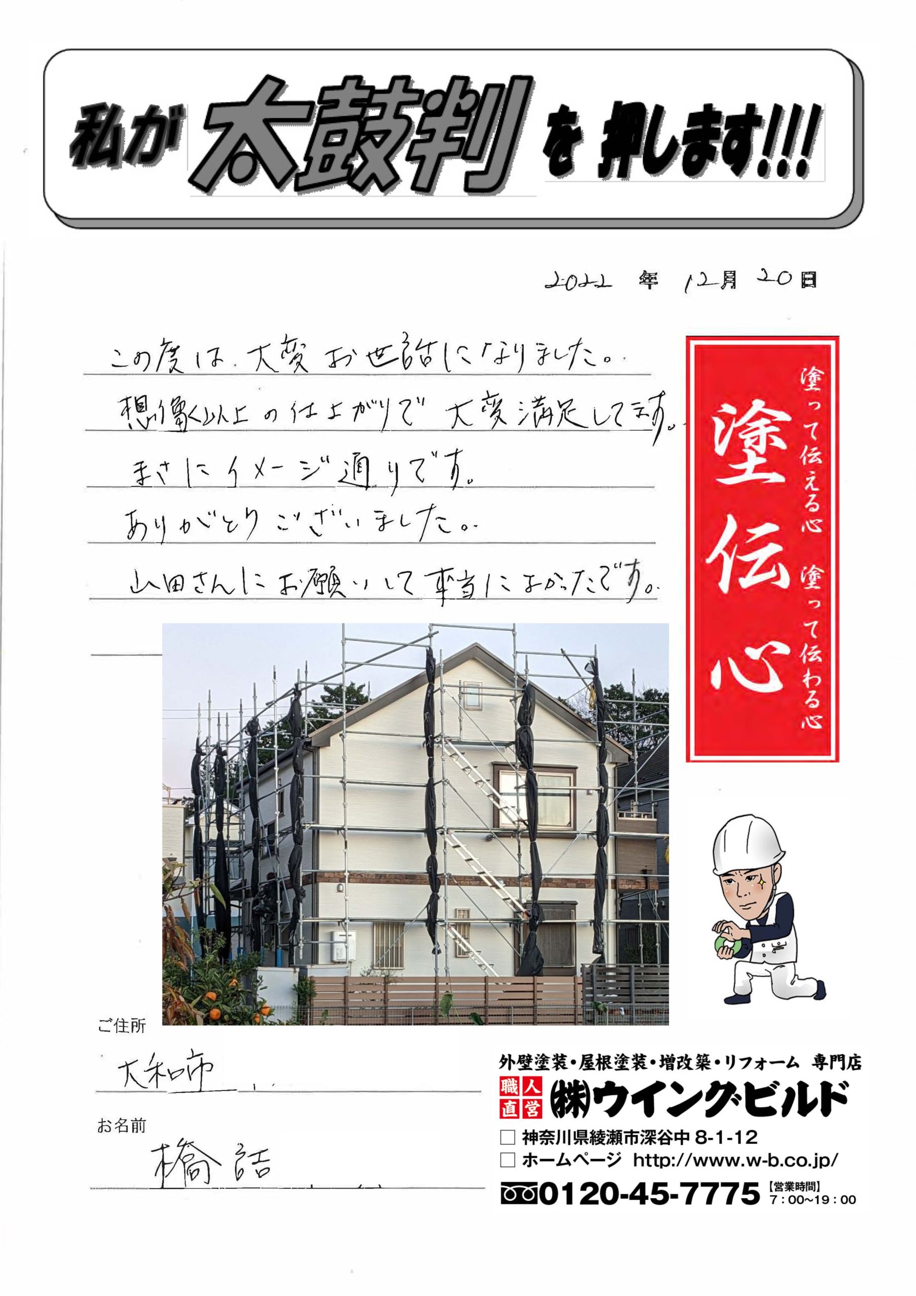 この度は大変お世話になりました。 想像以上の仕上がりで大変満足しています。 まさにイメージ通りです。 ありがとうございました。 山田さんにお願いして本当によかったです。