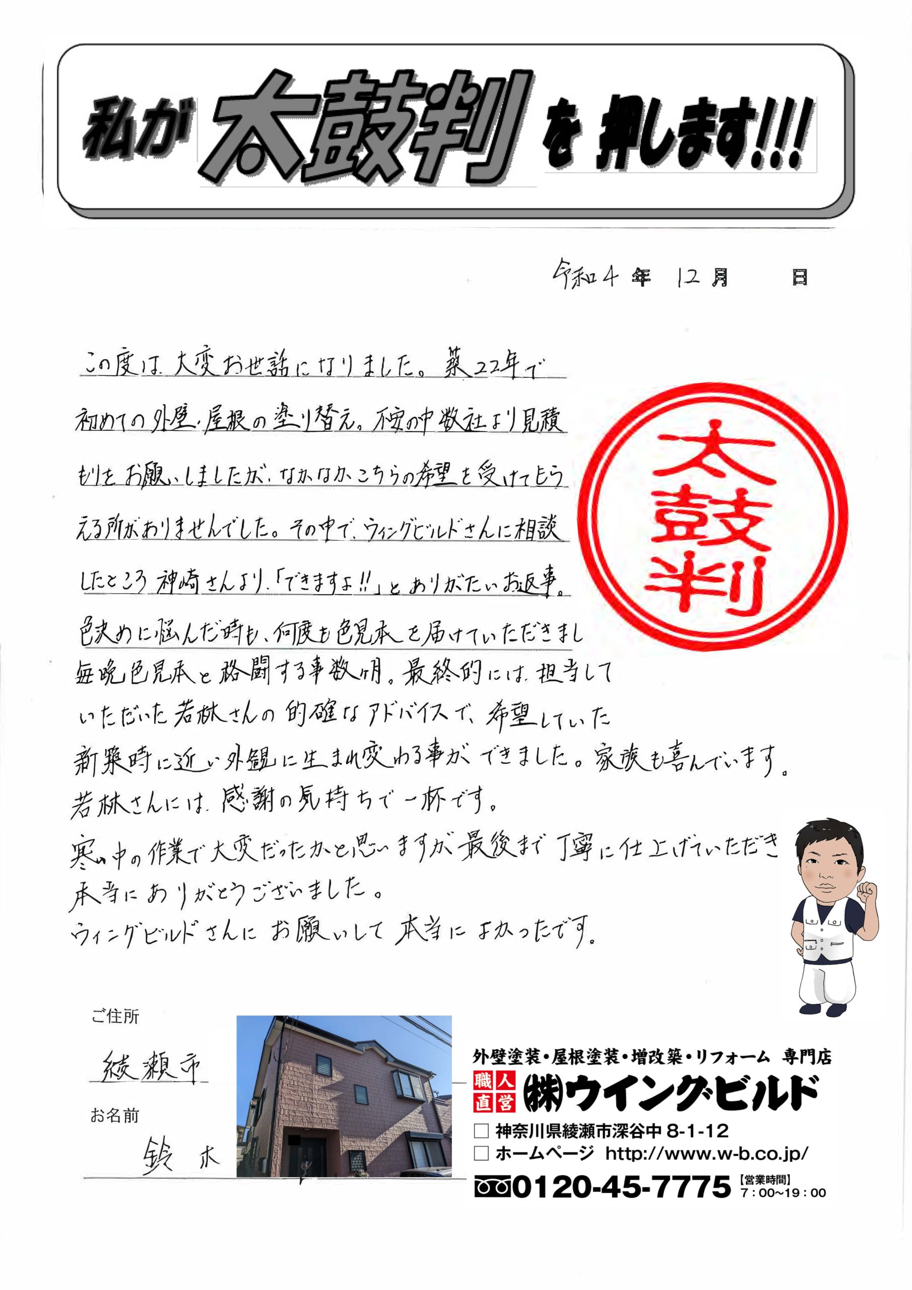 この度は大変お世話になりました。築22年で初めての外壁・屋根の塗り替え。不安の中、数社より見積もりをお願いしましたが、なかなかこちらの希望を受けてもらえる所がありませんでした。その中でウイングビルドさんに相談した所、神崎さんより『できますよ!』と有り難いお返事。色決めに悩んだ時も何度も色見本を届けていただきました。毎晩色見本と格闘する事数ヶ月。最終的には担当していただいた若林さんの的確なアドバイスで希望していた新築時に近い外観に生まれ変わることができました。家族も喜んでいます。若林さんには感謝の気持ちで一杯です。寒い中の作業で大変だったかと思いますが最後まで丁寧に仕上げていただき本当にありがとうございました。ウイングビルドさんにお願いして本当によかったです。