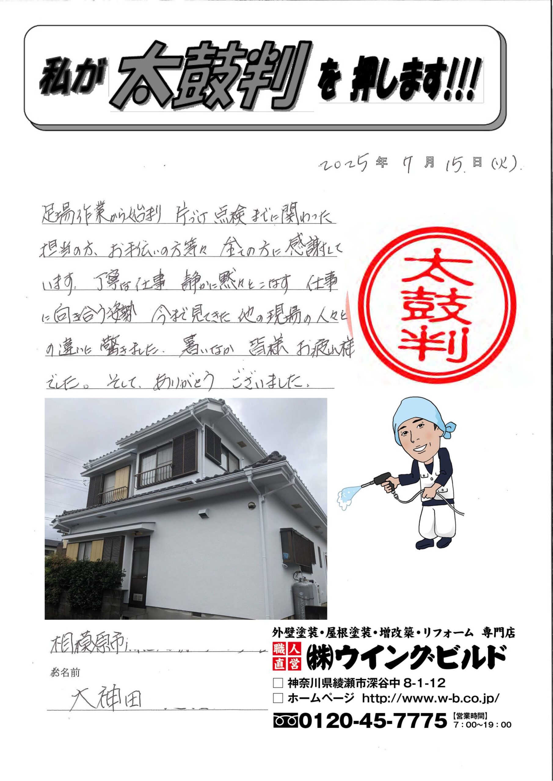 足場作業から始まり 片付け、点検までに関わった担当の方、お手伝いの方等々 全ての方に感謝しています。丁寧な仕事、静かに黙々とこなす仕事に向き合う姿勢 今まで見てきた他の現場の人々との違いに驚きました。暑いなか皆様お疲れ様でした。そしてありがとうございました。