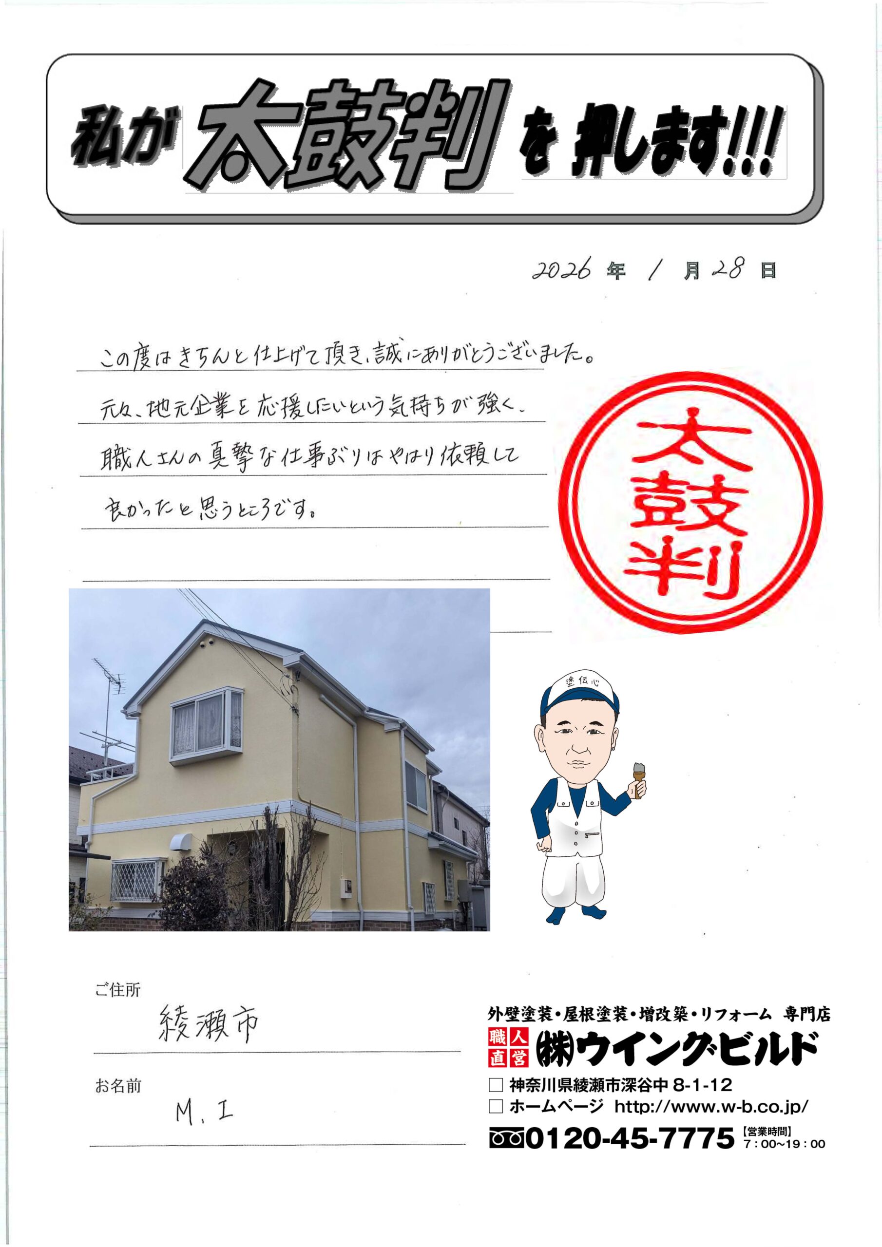 この度はきちんと仕上げて頂き誠にありがとうございました。元々、地元企業を応援したいという気持ちが強く、職人さんの真摯な仕事ぶりはやはり依頼して良かったと思うところです。